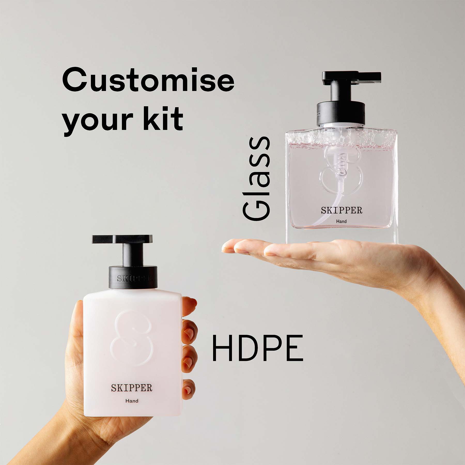 Customise your kit: Choose hand soap dispensers between crystal clear glass, or HDPE (high-density polyethylene) with a beautiful velvety matte finish.