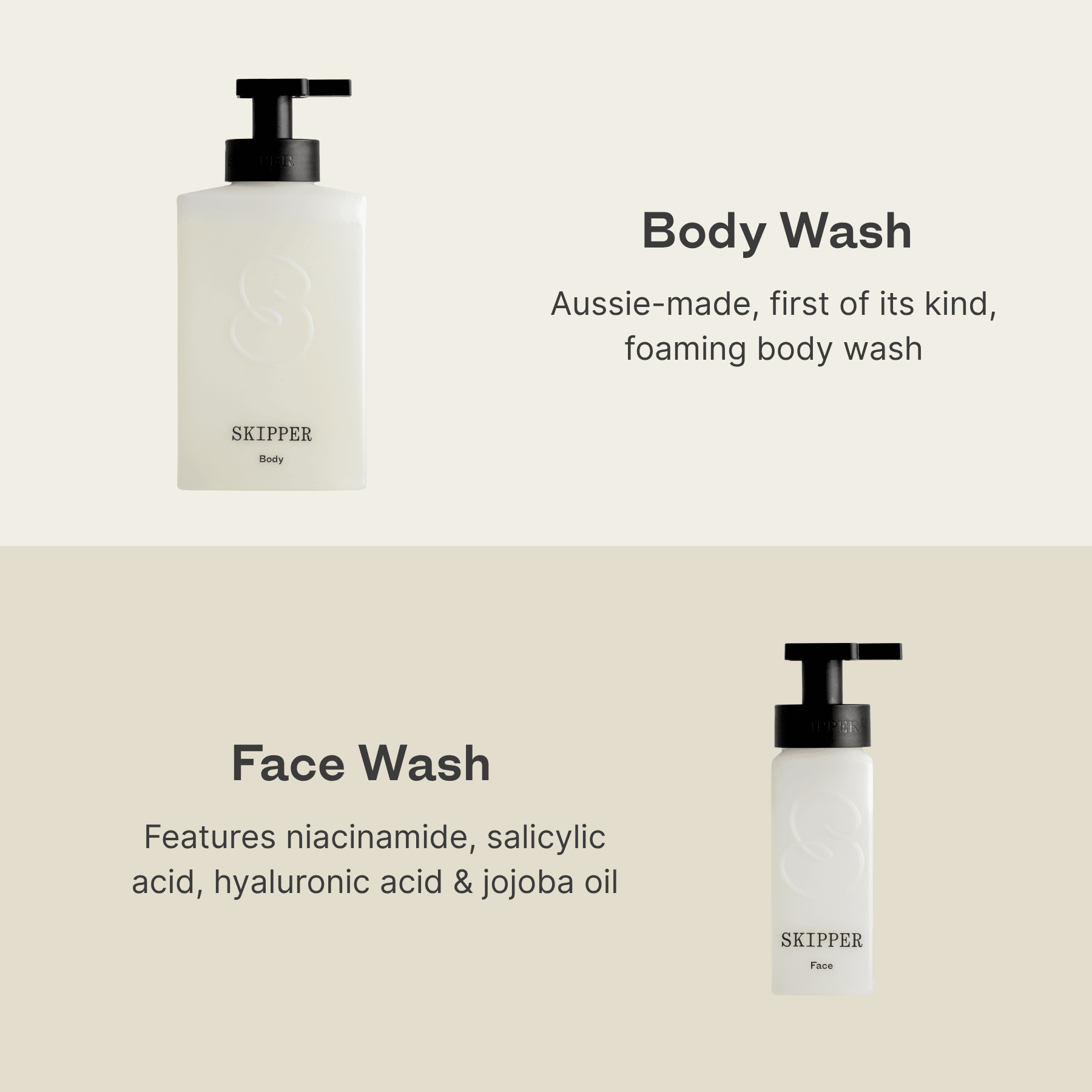 Spark a foamance with Skipper and elevate your skincare routine for good. Our Australian-made face and body wash has a unique silky foam lather that's suitable for all skin types. Produced locally with care, with quality ingredients you can be proud of.